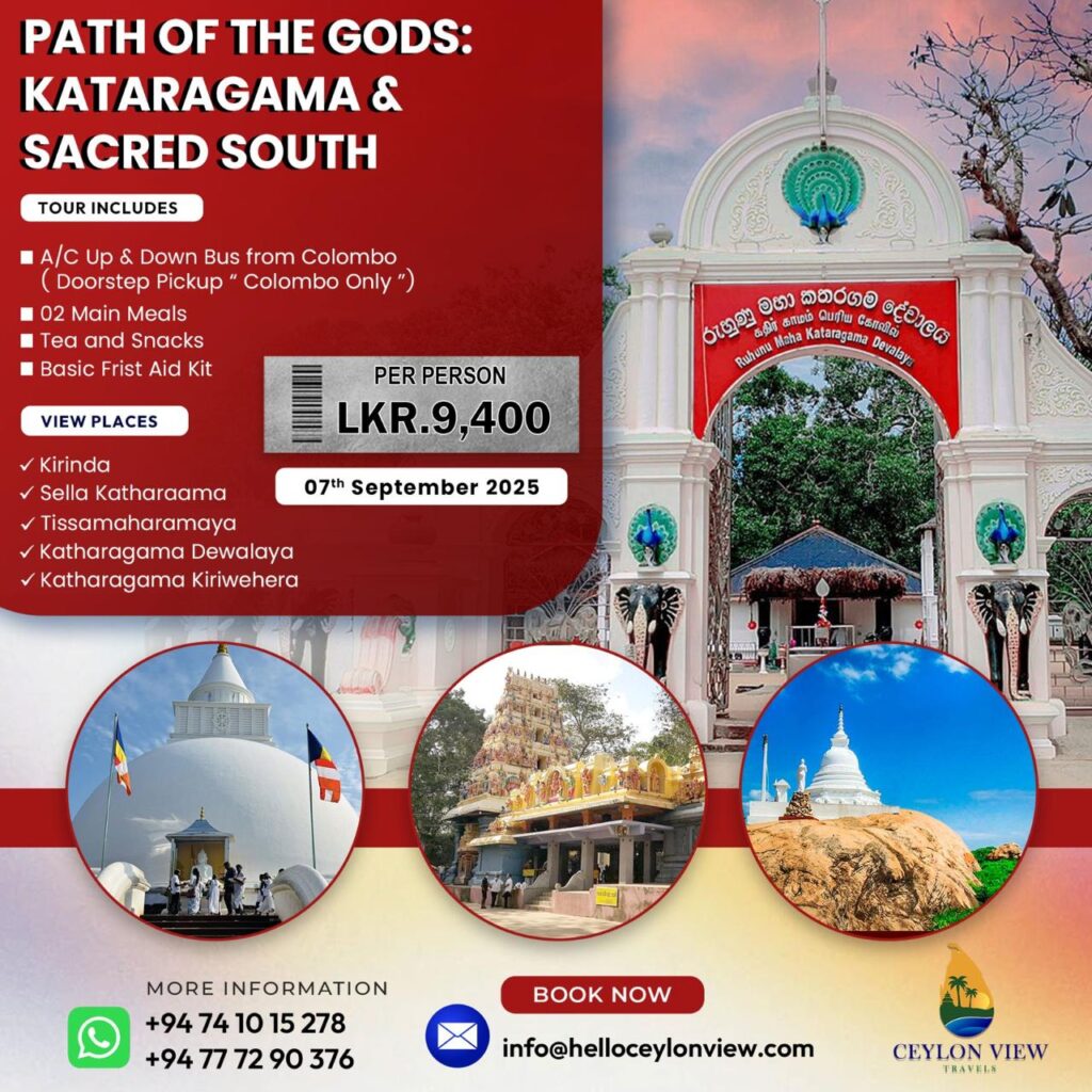Kataragama Next Schedule Date : 2025-Sep-7 (Sunday) Price (per person) : Rs. 9,400/- View Places Kirinda Sella Kataragama Thissamaharamaya Katharagama Devalaya Kirivehera Package Includes A/C Transport (Kottawa to Kottawa) 2 Main Meals Tea and Snacks Basic First Aid Kits All Entrance Tickets Other Tours Bakers Bend Safari 1-Day Trip Read More Sigiriya & Dambulla 1-Day