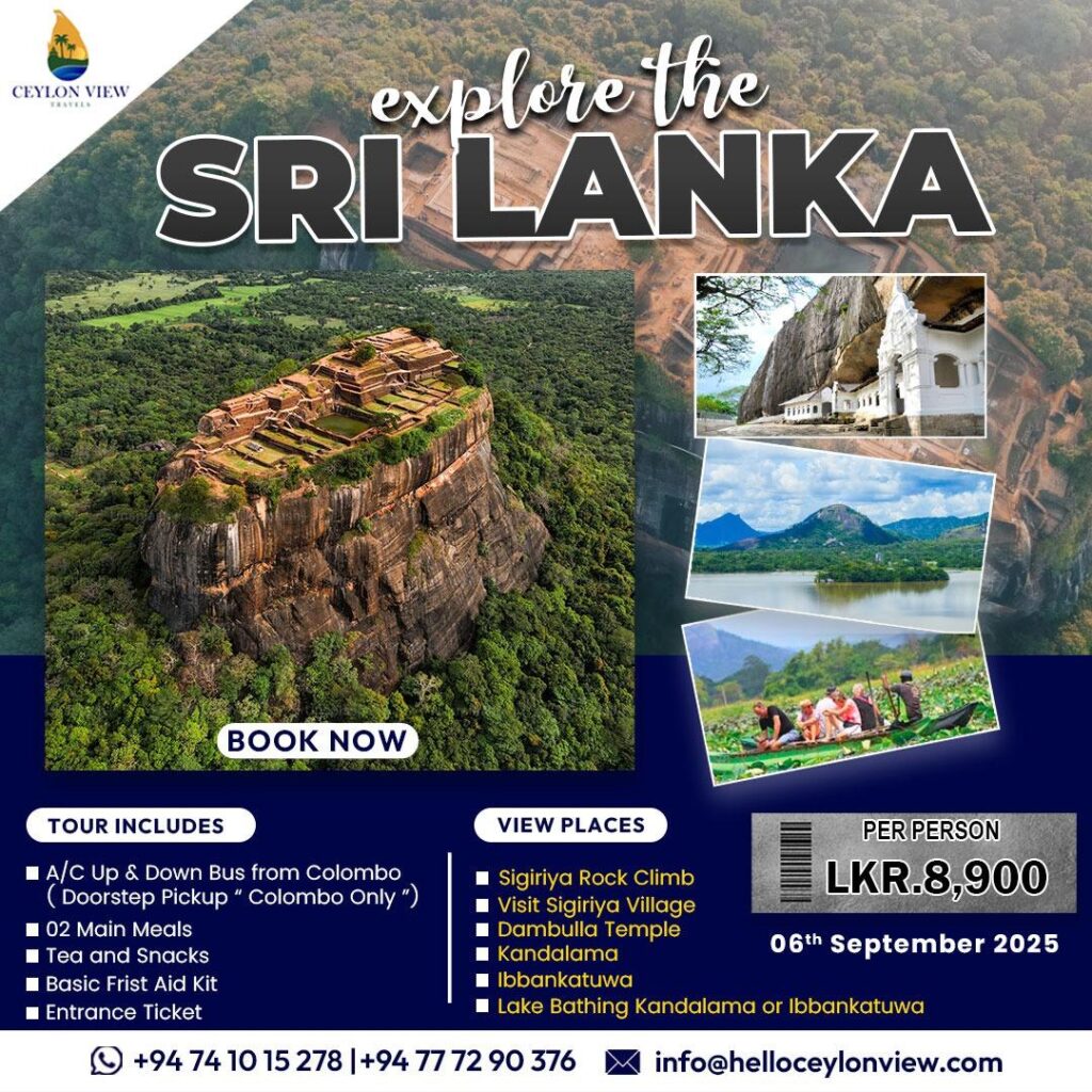 Sigiriya & Dambulla Next Schedule Date : 2025-Sep-6th Price (per person) : Rs. 8,900/- Tour Type : One-Day Tour View Places Sigiriya Rock Sigiriya Village Dambulla Temple Kandalama Ibbankatuwa Package Includes A/C Transport (Kottawa to Kottawa) 2 Main Meals Tour Guide Tea Snacks Basic First Aid Kits All Entrance Tickets Other Tours Bakers Bend Safari