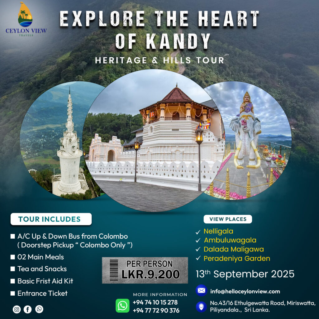 Kandy Next Schedule Date : 2025-Sep-13 Price (per person) : Rs. 9,200/- Tour Type : One-Day Tour View Places Nelligala Ambuluwawa Dalada Maligawa Peradeniya Garden Package Includes A/C Transport (Kottawa to Kottawa) 2 Main Meals Tea Snacks Basic First Aid Kits All Entrance Tickets Other Tours Bakers Bend Safari 1-Day Trip Read More Sigiriya &