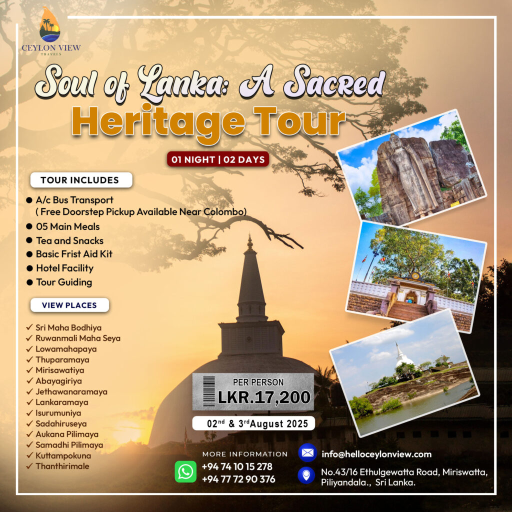 Anuradhapura Next Schedule Date : 2025-Sep-13 Price (per person) : Rs. 9,200/- Tour Type : Two-Days Tour View Places Sri Maha Bhodi Ruwanmali Maha Seya Lowamahapaya Thuparamaya Mirisawetiya Abhayagiriya Jethawanaramaya Lankaramaya Isurumuniya Sandahiruseya Awukana Pilimaya Samadhi Pilimaya Kuttam Pokuna Thanthirimale Package Includes A/C Transport (Kottawa to Kottawa) 2 Main Meals Accomodation / Hotel Facility Tour […]